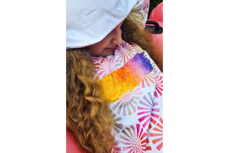 Sollten kleine Teilchen des Schaums herausschauen, so kann man vorsichtig mit einem Dampfbügeleisen (Stufe 2) oder einem Föhn über die Stickerei "schweben", um den Schaum zu schrumpfen.