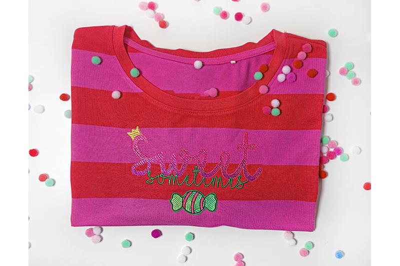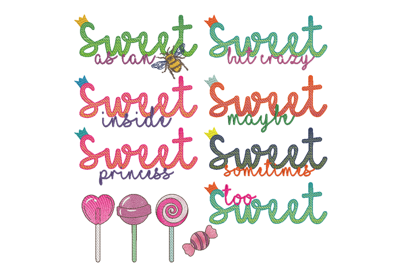 7 Schriftzüge für den 13 × 18 cm Stickrahmen: Sweet as can be, sweet but crazy, sweet inside, sweet maybe, sweet princess, sweet sometimes, too sweet.